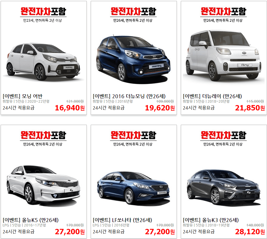 | 경차 (모닝, 레이) | 15,000원 ~ 40,000원 | 30,000원 ~ 70,000원 |